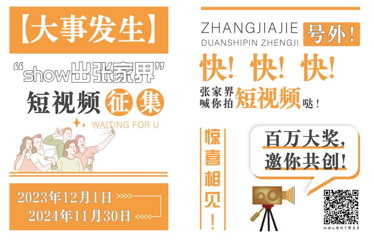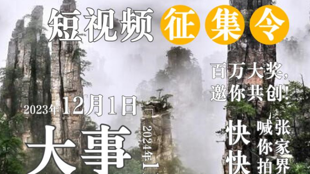 最新資訊2023.11.29關于開(kāi)展“Show出張家界”短視頻征集的公告!2023年12月1日—2024年11月30日,“Show出張家界”短視頻征集百萬大獎等你來拿!月度、季度、年度抖音、小紅書短視頻評選。查看詳情