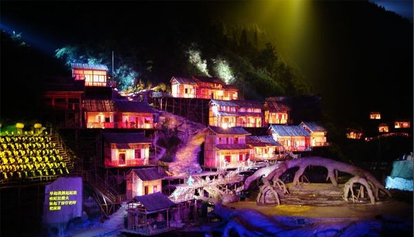 該劇由中國(guó)實景演出創始人梅帥元執導,享譽世界的華人音樂家譚盾擔任音樂總監,舞台搭建于天門山下峽谷中,以落差一千多米的張家界天門山爲背景,以山澗峽谷爲表演舞台,1.2億巨資打造,500演員同台傾情演繹。