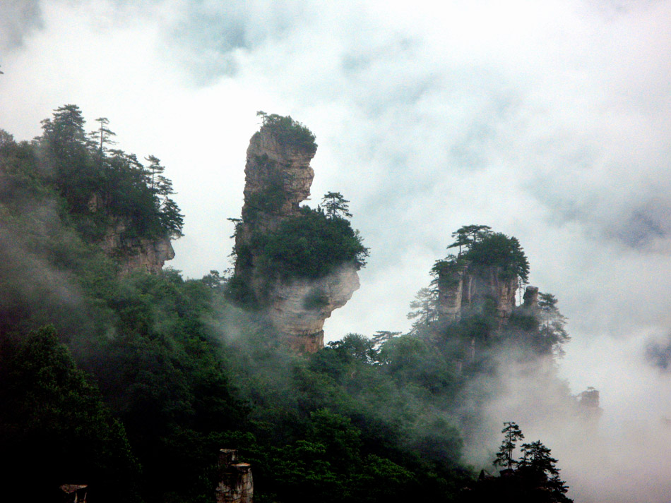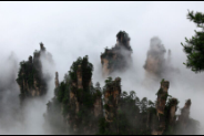 位于天子閣80米西側深谷中。一排6根石柱,每柱高約百米,方正如削,頂天并立,參差相連,且上細下粗,形如筆杆。傳爲向(xiàng)王天子所用之筆。四周諸峰呈環形之勢,相互抱擁,近前左右空曠,翠樹纏擁,其後(hòu)千百峰巒在霧霭中漸漸退隐。唯此禦筆峰叢所處位置偏高,線條、棱角清晰可見,更顯突兀高峻。尤其是柱石纖細,仿佛人造,縫痕如撕,依次相依,又有蒼松幾棵傲立其間,俊美非凡。